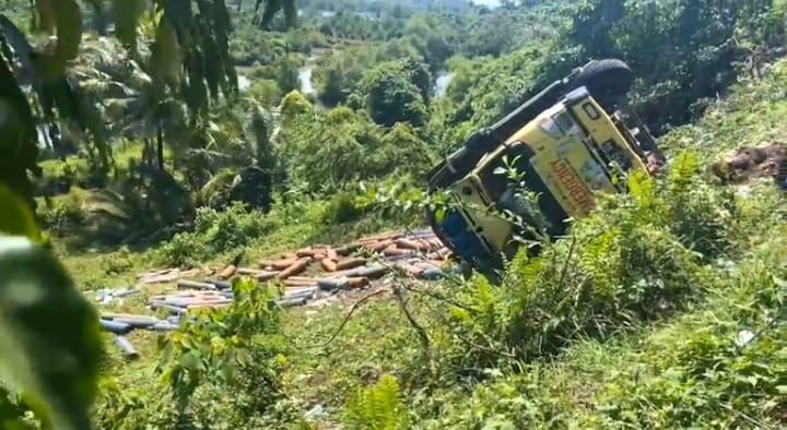 Truk yang membawa tabung oksigen terjun kejurang di Kelurahan Sampoddo, Kecamatan Wara Selatan, Kota Palopo, Kamis 24 Juli 2025. (ist)