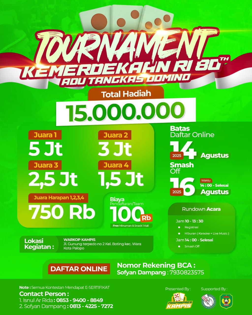 PALOPO, TEKAPE.co – Dalam rangka memeriahkan peringatan Hari Kemerdekaan Republik Indonesia yang ke-80, panitia pelaksana menggelar Turnamen Adu Tangkas Domino 2025 yang akan diselenggarakan Sabtu, 16 Agustus 2025, mendatang.