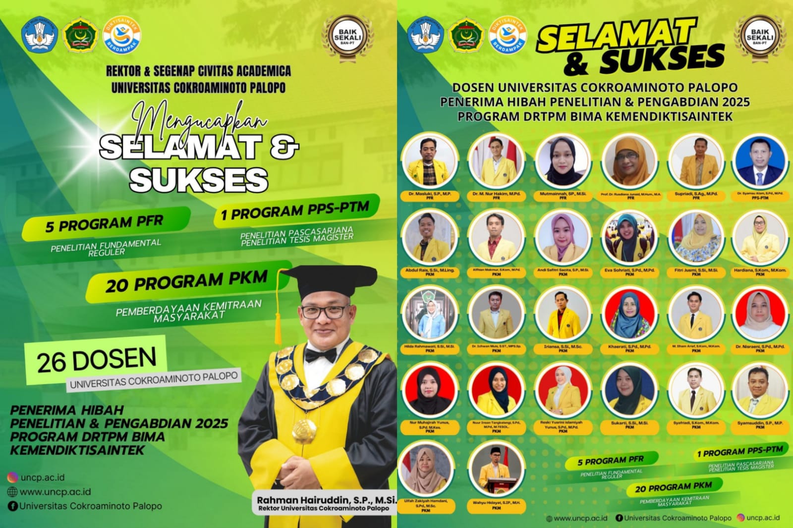 Sebanyak 26 dosen UNCP berhasil meraih pendanaan hibah Penelitian dan Pengabdian kepada Masyarakat Tahun 2025 dari Kementerian Pendidikan Tinggi, Sains, dan Teknologi (Kemendiktisaintek) melalui Direktorat Jenderal Riset dan Pengembangan.