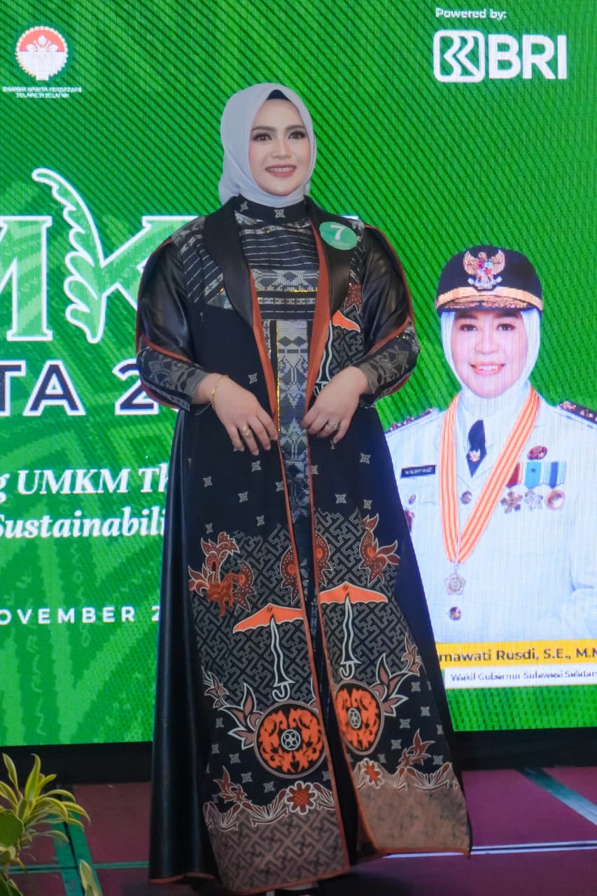 Wakil Ketua Dekranasda Luwu Pamerkan Gaun Motif Luwu di UMKM FI3STA 2025